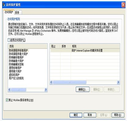 这时会看到 ”访问保护规则”的界面,勾选”启用访问保护”和”禁止McAfee服务器被停 止”,如图三