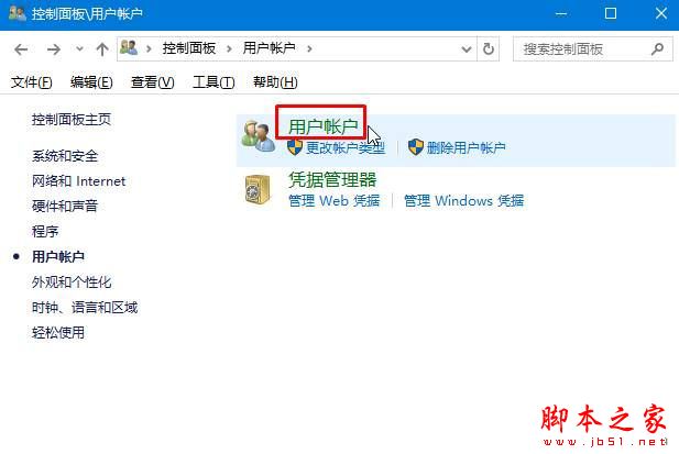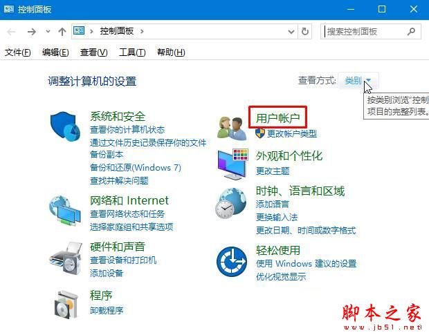 2、在控制面板里点击【用户账户】(查看方式为“类别”);