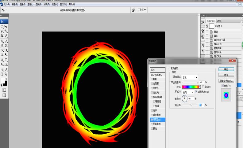6、在软件右下角选择“添加图层样式”中的“渐变叠加”,并在弹出的对话框设置样式为“径向”、渐变为“彩虹”,缩放为90,确定即可,如下图所示。