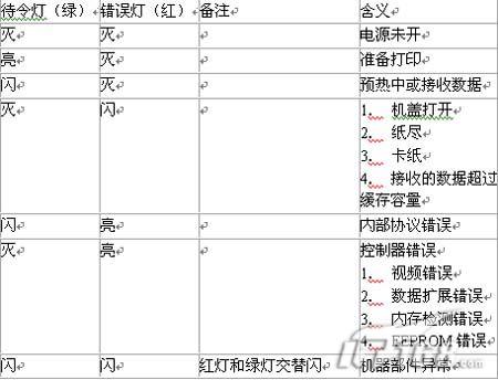 2. 指示灯显示型 其故障代码通过打印机控制面板上的指示灯或闪或亮的不同组合分别予以显示。代表机型有:EPL-5900、EPL-6100等;
