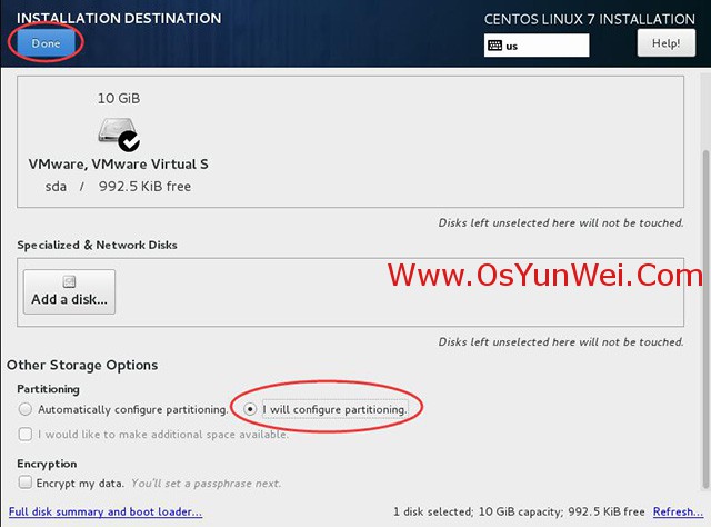 选择-系统SYSTEM-安装位置INSTALLTION DESTINATION,进入磁盘分区界面