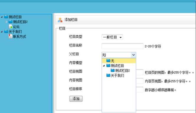 浏览栏目这块做个一个树形列表,添加栏目的左侧部分只写了句“左侧列表”就是指这个树形列表,等我们写完替换一下就可以了。