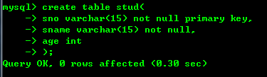 create table stud( sno varchar(15) not null primary key, sname varchar(15) not null, age int ); //创建一个表格stud,包含3列:sno,sname,age. not null —表示非null。 primary key —设置主键,也就是sno名字必须唯一!