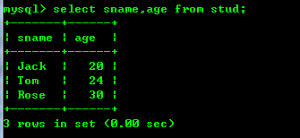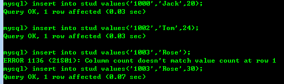 (这里是属于DDL的) insert into stud values(‘1000','Jack',20); insert into stud values(‘1002','Tom',24); insert into stud values(‘1003','Rose');//这句是错误的,不能少!(后面有指定插入哪几列的方法) insert into stud values(‘1003','Rose',30); 为stud表格增加一行并赋值