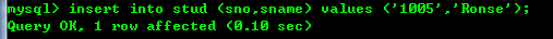 insert into stud (sno,sname) values (‘1005','Ronse');