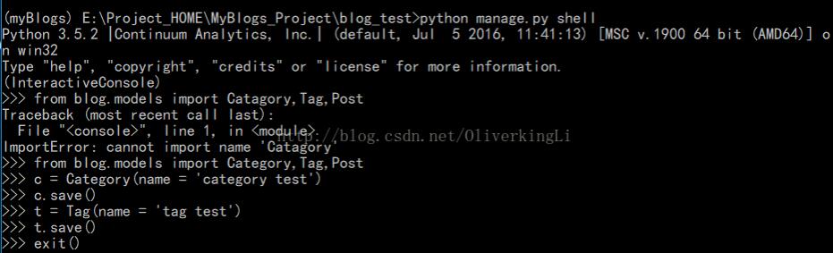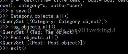 首先导入 3 个之前写好的模型类,然后实例化了一个 Category 类和一个 Tag 类,为他们的属性 name 赋了值。为了让 Django 把这些数据保存进数据库,调用实例的 save 方法即可。