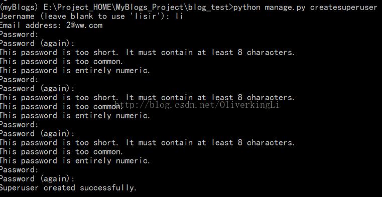 再创建一篇文章试试,但创建文章之前,我们需要先创建一个 User,用于指定文章的作者。创建 User 的命令 Django 已经帮我们写好了,依然是通过 manage.py 来运行。首先按住 Ctrl + c 退出命令交互栏(一次退不出就连续多按几次),运行 python manage.py createsuperuser 命令并根据提示创建用户: