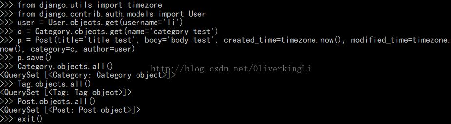 由于我们重启了 shell,因此需要重新导入了 Category、Tag、Post 以及 User。我们还导入了一个 Django 提供的辅助模块 timezone,这是因为我们需要调用它的 now() 方法为 created_time 和 modified_time 指定时间,容易理解 now 方法返回当前时间。然后我们根据用户名和分类名,通过 get 方法取出了存在数据库中的 User 和 Category(取数据的方法将在下面介绍)。接着我们为文章指定了 title、body 、created_time、modified_time值,并把它和前面创建的 Category 以及 User 关联了起来。允许为空 excerpt、tags 我们就没有为它们指定值了。