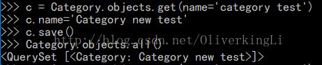 注意:我们这里使用 get 方法根据 Category 的 name 属性的值获取分类的一条记录。Category.objects.get(name='category test') 的含义是从数据库中取出 name 的值为 category test 的分类记录。确保数据库中只有一条值为 category test 的记录,否则 get 方法将返回一个 MultipleObjectsReturned 异常。如果你不小心已经存了多条记录,请删掉多余的记录。如何删除数据请看下文。
