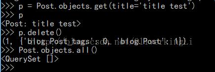 先根据标题 title 的值从数据库中取出 Post,保存在变量 p 中,然后调用它的delete 方法,最后看到 Post.objects.all() 返回了一个空的 QuerySet(类似于一个列表),表明数据库中已经没有 Post,Post 已经被删除了。