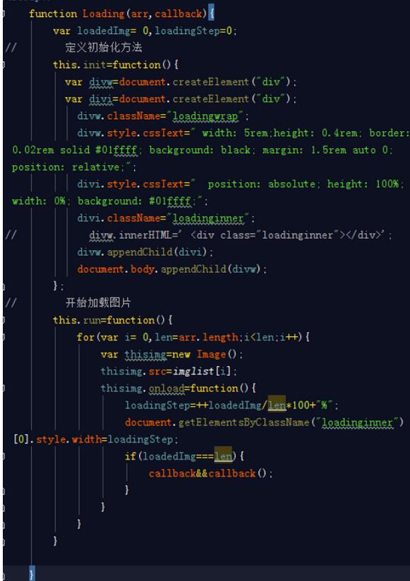 为了让我们编写的网页进度条满足现有需求,又足够轻便,所以使用原生js写一个构造函数,为了见名知义,可以把该函数命名为”Loading”。该函数接收2个参数,分别为arr、callback。其中arr定义图片数组,callback定义执行完成后回调函数。该构造函数内部,遍历图片数组加载图片,每加载完一张图片,修改进度条进度,直至全部加载完成,进度条进度为100%。