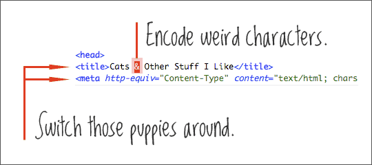 字符集声明应当放在 <hea> 部分的最前面,以便让浏览器知道如何显示网页中的所有内容,包括标题。另外,一些特殊字符,如 & 最好用 & 代替,这是一种最安全的方法。
