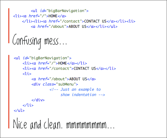 缩进不会影响网页的渲染,但会明显改善阅读源代码时的体验。缩进没有特定的规则,但始终保持一致是个好习惯。