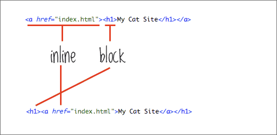 如下图,第一行代码中,<h1>标签嵌套在 <a>标签中,尽管多数浏览器会正确渲染,但这不是好的习惯, 标签是 block 对象,而 是 inline 对象,inline 对象不应该容纳 block 对象。