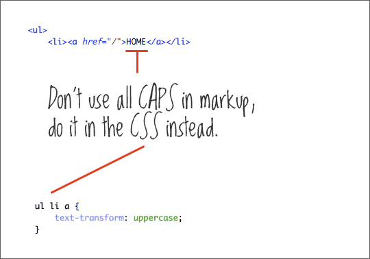 如下图所示,不要直接使用大写,用 CSS 对这些文字排版方面的格式进行控制,这样会更灵活。