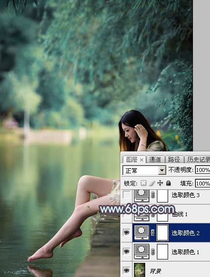 2、创建可选颜色调整图层,对绿色进行调整,参数及效果如下图。这一步同样把绿色转为青绿色。