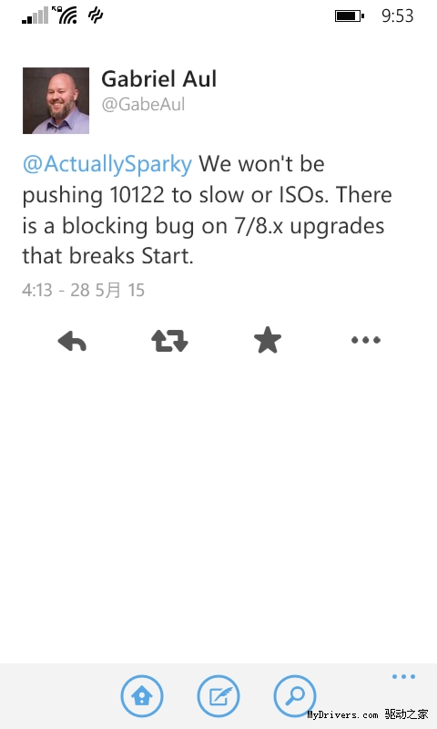 同时在对今天的Build 10122的更新补丁进行说明时,Gabriel Aul也表示,因为存在bug的原因,Build 10122将不会推送给Windows Insider“慢速”更新用户,也不会推出ISO镜像。