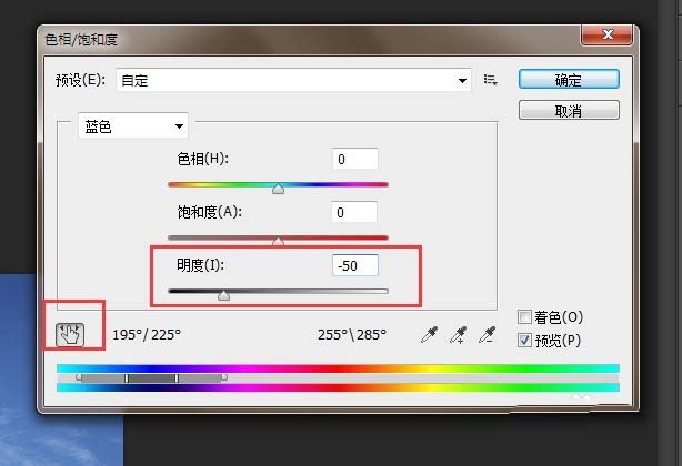 2、选择 图像 - 调整 - 色相/饱和度 ,点击带有左右箭头的手指图标, 在图片 天空处点击,明度调整到-50,此时图像效果已经变暗。