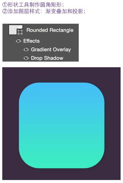 2、添加图层样式:渐变叠加和投影,参数及效果如下图。
