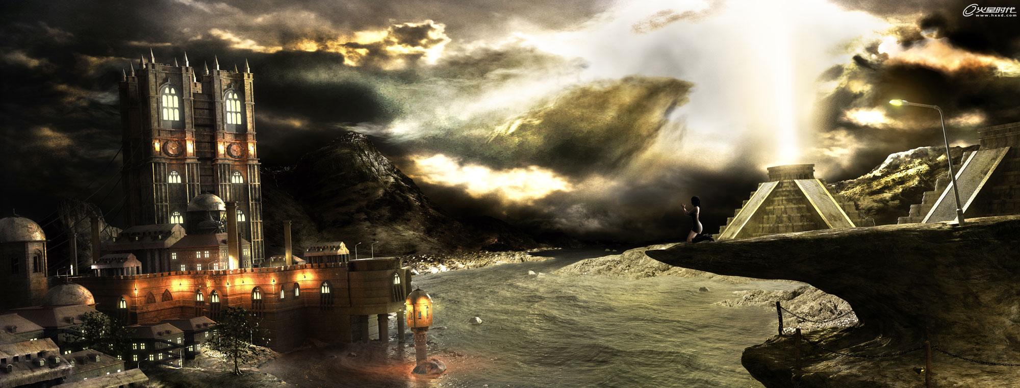 这篇教程是向大家解析3DSMAX三维静帧画面《祈祷》的制作过程,教程难度高级,需要学习者有不错的功底,在《祈祷》这幅作品中,作者主要想要表达一种阴森恐怖的风格,为此,画面中的所有元素——金字塔、破旧的路灯、哥特式建筑、密布的云层以及角落唯一一棵树,都有着一种颓废和神秘的色彩。先来看看效果图吧: