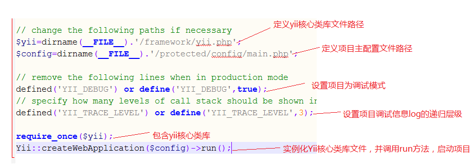 在Yii启动项目时,传递了项目主配置文件数组,那么Yii会在整个应用中绑定一个全局的Yii对象并且可以通过如下方法来调用该对象:Yii::app()