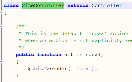 通过上面的路由访问到的就是:SiteController.php类文件下的SiteController类中的actionIndex方法