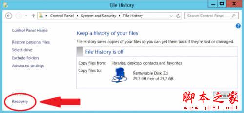 5、在“文件历史”窗口,点击左下角的“恢复”(Recovery)。然后在恢复窗口出现时,选择创建一个恢复盘。