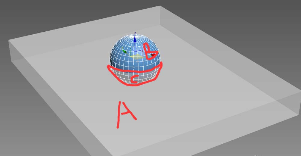1、物体A与物体B有穿插部分,球体底部C为穿插部分,实际在渲染上是看不到的,这里我们可以把看不到的删除来达到减面的目的。