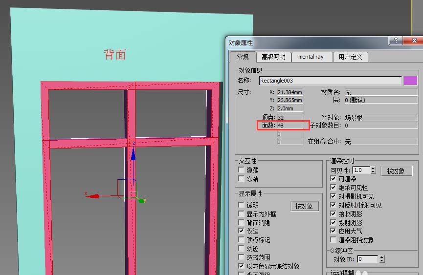 3、窗框选择的红色面在正面渲染的时候是看不到的,没删除之前为48个面,删除后为32个面,渲染正面是不影响渲染结果的。