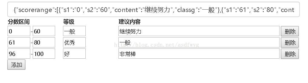 实现效果如下,在编辑表格的同时可以实现字段json内容的自动变化,点击提交可以保存到后台,页面加载的时候自动解析json并加载表格内容。该代码解析和加载功能都用前端js实现,简化了后台代码逻辑。