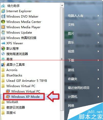 1、点击Windows7操作系统中的开始菜单→所有程序→Windows Virtual PC→Windows XP Mode