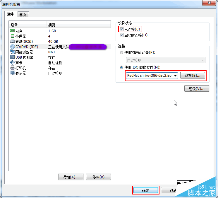 不过,大多数人都没有勾选上图【设备状态】面板中的【已连接】,从而导致更换后的ISO镜像文件并没有生效,因此RedHat Linux安装程序也检测不到更换后的光盘,从而提示错误信息:该光盘无法被挂载。