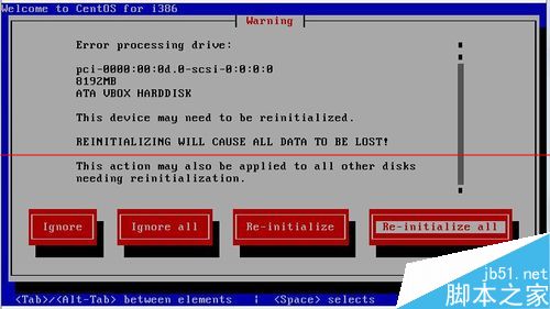 这个设备需要重新初始化,重新初始化将导致所有数据丢失!这个动作也可以应用于其他需要重新初始化磁盘,选项中Ignore 忽略 Ingnore all 忽略所有 Re-initialize 重新初始化 Re-initialize all重新初始化所有,这里选择Re-initialize all