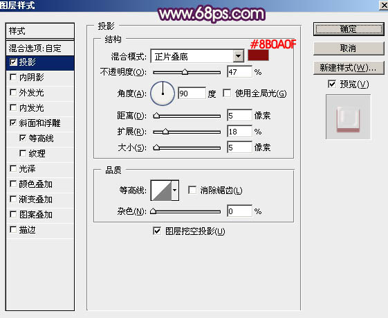投影:混合模式“正片叠底”,颜色为暗红色:#880a0f,其它设置如下图。