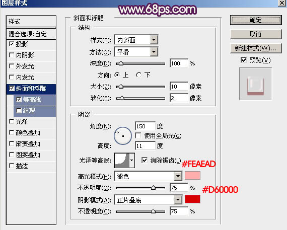 斜面和浮雕:高光颜色:#feaead,阴影颜色:#d60000,其它设置如下图。