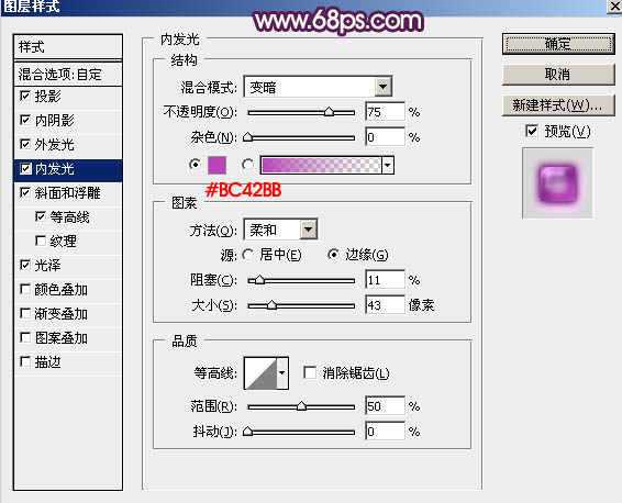 内发光:混合模式“变暗”,颜色为紫色:#bc42bb,其它设置如下图。