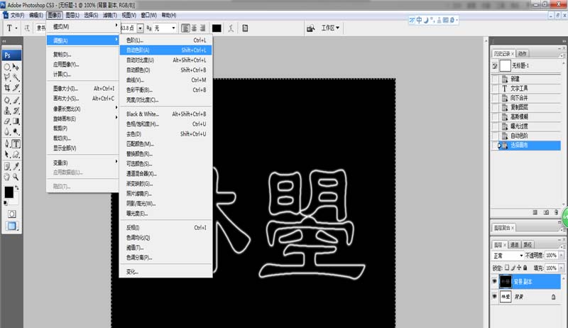 5、为文字添加自动色阶效果。首先,在主菜单栏中【图像】-【调整】-【自动色阶】;然后,输入“Ctrl+A”选择全部画布,再输入“Ctrl+C”复制该图层,如下图所示。
