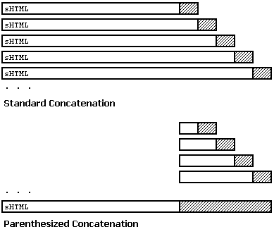 乍一看,可能很难发现这段代码与上一个代码示例的差别。其实,此代码只是在 sHTML = sHTML & 后的内容外面加上了括号。这实际上是通过更改优先顺序,来减小大多数字符串连接操作中处理的字符串大小。在最初的代码示例中,ASP 编译器将查看等号右边的表达式,并从左到右进行计算。结果,每次重复都要进行 16 个连接操作,这些操作针对不断增长的 sHTML 进行。在新版本中,我们提示编译器更改操作顺序。现在,它将按从左到右、从括号内到括号外的顺序计算表达式。此技术使得每次重复包括 15 个连接操作,这些操作针对的是不会增长的较小字符串,只有一个是针对不断增长的大的 sHTML。图 1 显示了这种优化方法与标准连接方法在内存使用模式方面的比较。