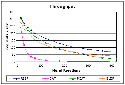 下面的一系列图表显示了各种方法对整个应用程序吞吐量的影响,以及 ASP 页面的响应时间。通过这些图表,我们可以了解应用程序支持的请求数目,以及用户等待页面下载至浏览器所需的时间。