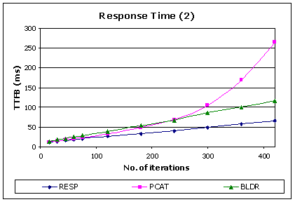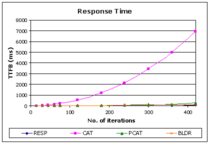 图 3 和图 4 中的图表显示了按“到第一字节的时间”测量的响应时间(以毫秒为单位)。因为标准字符串连接方法 (CAT) 的响应时间增加过快,所以又提供了未包括此方法的图表(图 4),以便分析其他方法之间的差异。有一点值得注意,多重 Response.Write 方法 (RESP) 和 StringBuilder 方法 (BLDR) 随重复次数的增加呈现一种近似线性的增长,而标准连接方法 (CAT) 和加括号的方法 (PCAT) 则在超过一定的阈值之后开始迅速增加。