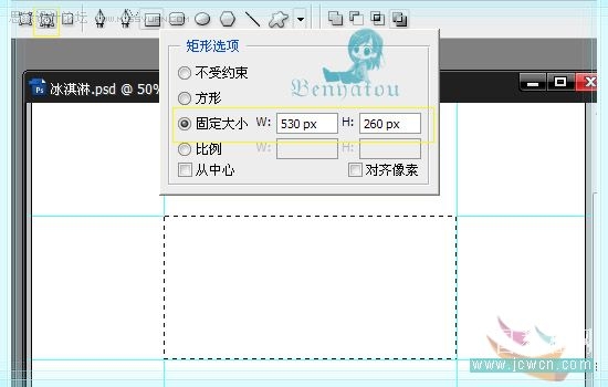 第二步:选择矩形工具,并设置为路径,在场景中间绘制一个宽530像素,高260像素的矩形选框,然后按Ctrl+R打开标尺,拖出如图的参考线
