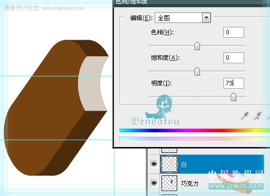 将上面新建的那个图层改名为“巧克力”,再把巧克力图层复制一份,改名为白,选中白图层,按Ctrl+U打开色相饱和度,把明度设置为75,如图
