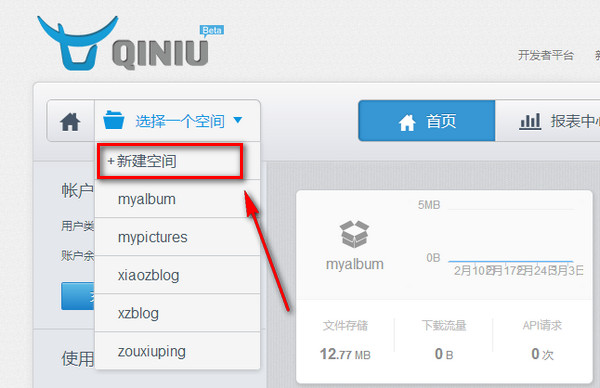 3、注册成功后,进入管理页面>>新建一个空间>>设置空间名字(访问控制设为公开空间)