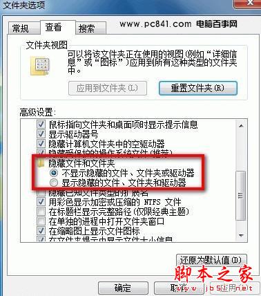 进入 文件夹选项进入的操作其实就和上面windows xp系统中的操作一样了,下面简单再介绍下:文件夹选项-查看-隐藏文件和文件夹---将不显示隐藏文件、文件夹或驱动器修改为-显示隐藏文件、文件夹或驱动器,确定即可。