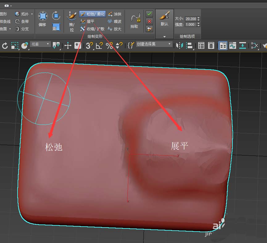 3、展开石墨建模工具栏,切换到自由形式选项卡,按下绘制变形面板下的展平按钮,接着直接在模型表面拖动鼠标,反复拖动后最终效果如图。