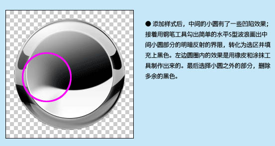 5、添加样式后,中间的小圆有了一些凹陷效果,接着用钢笔工具勾出简单的水平S型波浪画出中间小圆部分的明暗反射的界限,转化为选区并填充黑色。左边圆圈内的效果是用橡皮和涂抹工具制作出来的。最后选择小圆之外的部分,删除多出的黑色。