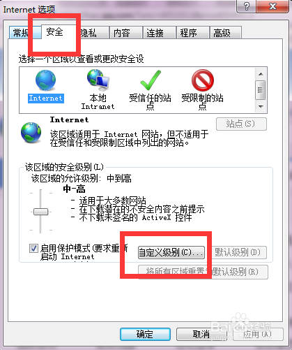 4、切换至“安全”选项卡,单击“自定义级别”按钮,弹出“安全设置-Internet区域”对话框,如下图所示。