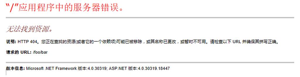 如果我们链接到一个静态页路径(e.g. foo.html) 或一个不匹配我们路由配置的URL (e.g. /foo/bar/foo/bar),我们会看到到一个标准的IIS 404错误页面.