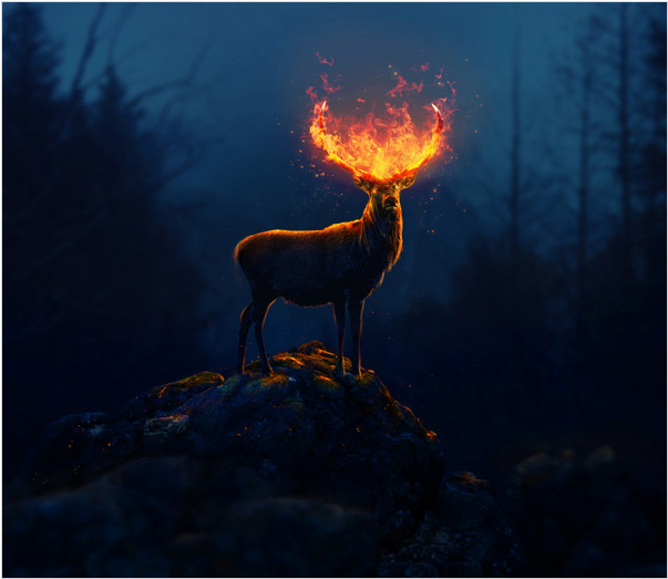 作者合成图片的方法非常细腻,过程:先合成一幅教暗的背景图片;再加入鹿,并用火焰素材给鹿角部分增加火焰;再根据光源位置,给鹿局部及地面部分增加火焰反光即可。