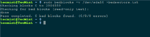 然后用如下命令检查你的 Linux 硬盘上的坏道/坏块: